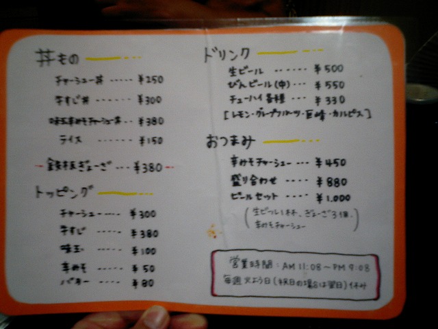 メニューを見ていて気が付いたんですが営業時間がPM9:08ですね、入店が9:03なんでマジでギリギリでした。
