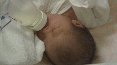 寝てる所を起こされて看護士さんに哺乳瓶を咥えさせられてる所です」、凄い勢いで飲んでました。