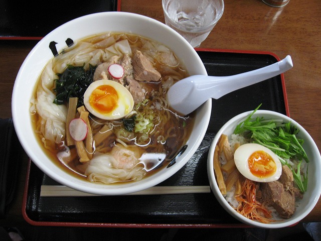 密かに激烈腹減りだった俺は、「冷やし海老ワンタンメン」(780円)とチャーシュー丼(小)」(280円)をチョイス。