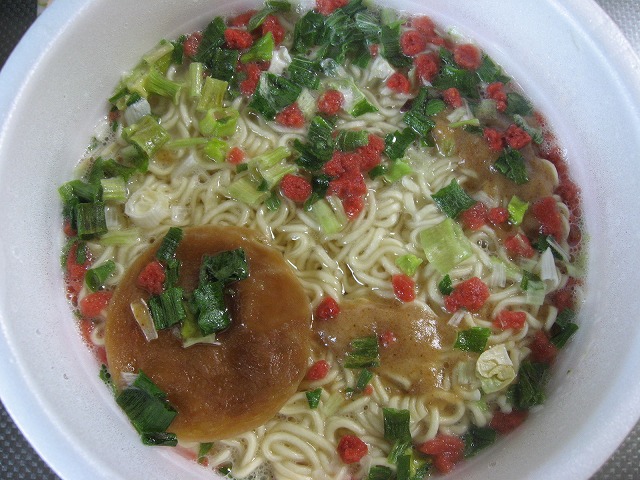 麺はノンフライの細麺、4分も待たせただけあって割と食感は良い感じですね。