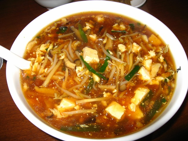 モヤシ、ニラ、豆腐、溶き玉子、シイタケの入ったあんかけが掛かっていて熱々でした。