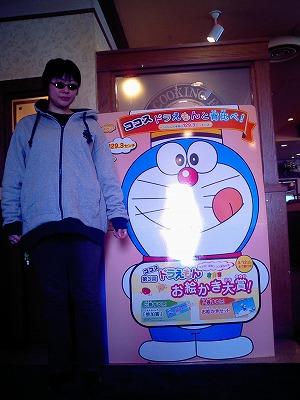 待ってる間暇だったんで、ドラえもんの立て看板と嫁を並ばせて携帯で撮影して遊んでました、そん時の写真がこちら。