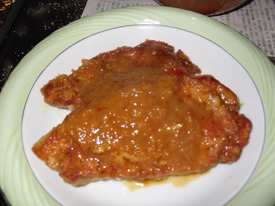 さっと絡めて、豚肉を皿に盛り付け、残ったフライパンのタレにバターを加えて濃厚ソースを作って、盛り付けた皿にかけてあげたら、ハイ、出来上がり~♪
