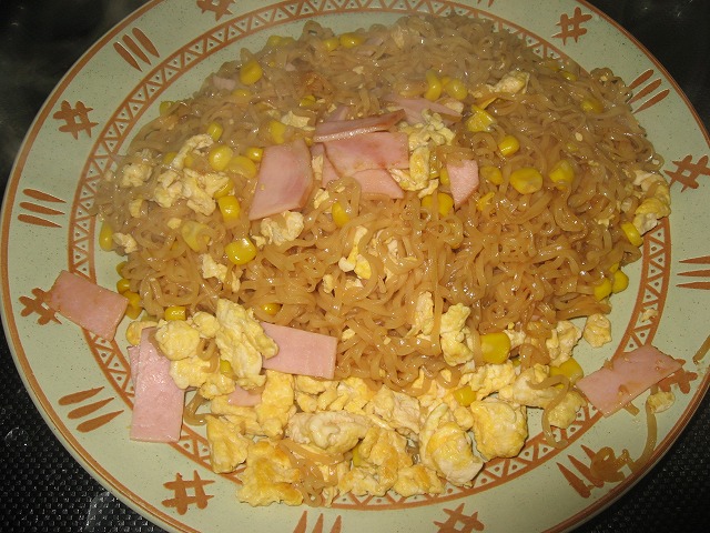 作り方に従い、フライパンに付属の炒め油を引いて、卵を落として入り卵を作って、そこに麺と水を加えてほぐして、お好みで冷蔵庫にあったハムなんぞを入れて完成!