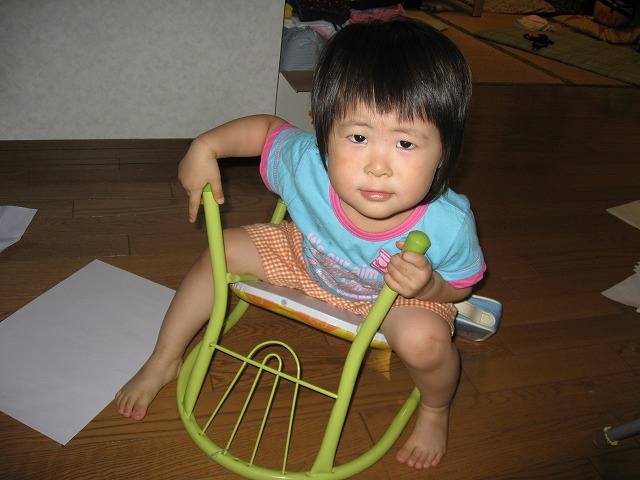 子供用の椅子を裏返しにしてまたがった常態で、フローリングをするすると乗って歩くのです。