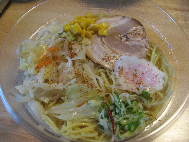 具は叉焼、ナルト、ネギ、キャベツ、ニンジン、コーン、赤唐辛子、それからお好みで七味唐辛子。