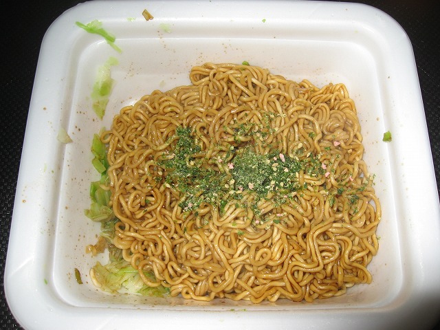 お湯を注いで待つ事3分、湯切りの後に粉末ソースを混ぜ混ぜして完成。