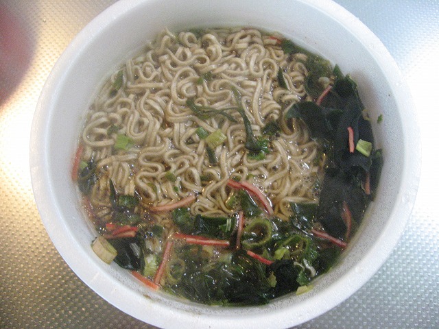 何って事を考えながらお湯を注いで待つこと3分。(うどんは5分だったのに流石そば、湯で時間3分ですね、少し細いって事かな?)