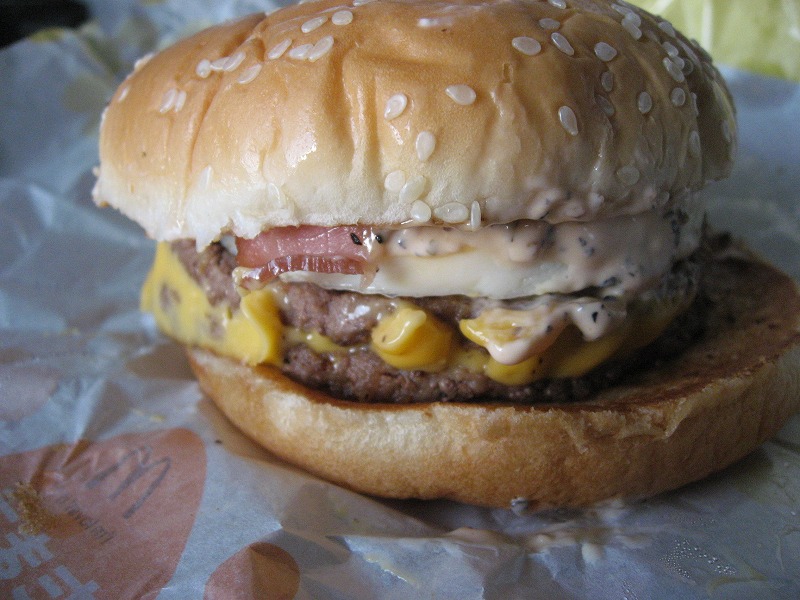 内容物を説明しちゃいますと、ビーフパティを2枚、ベーコン、目玉焼き、それとチーズを胡麻付きバンズでサンド、ソースはケチャップとマヨネーズを合わせたオーロラソースにコショウを加えたものだそうです。