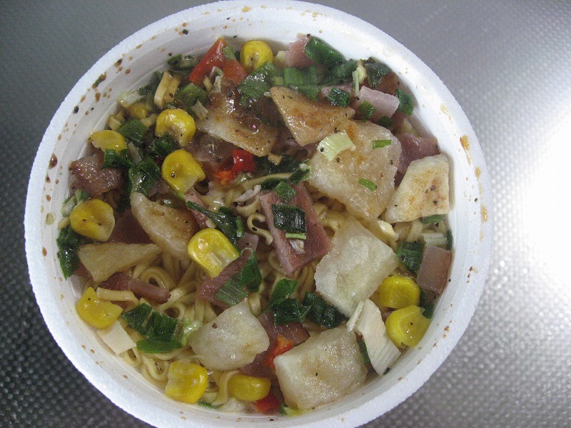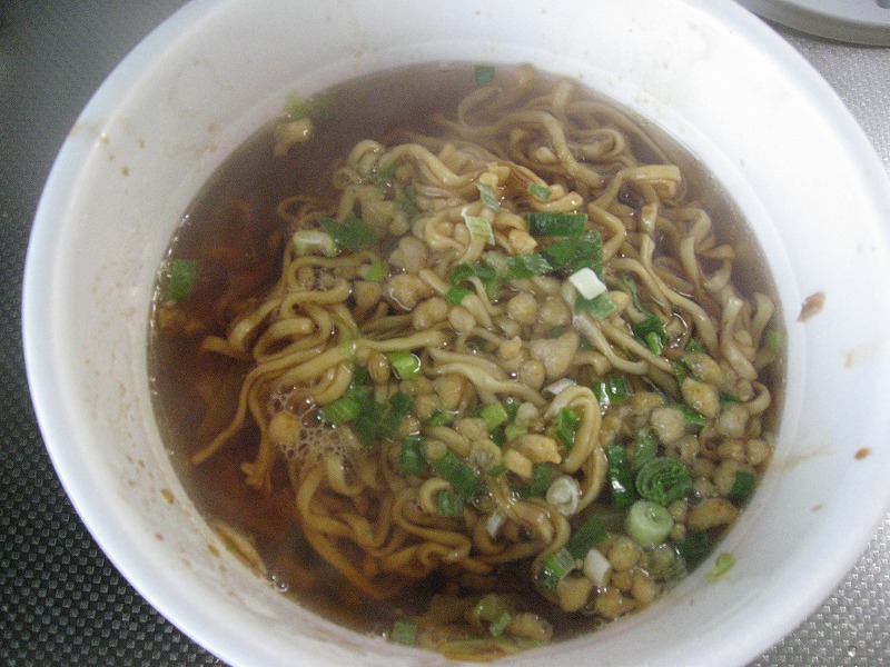 麺はいつものカップヌードルのフライ麺、スープは醤油味でニンニクやショウガ、それと黒コショウが利いていました。