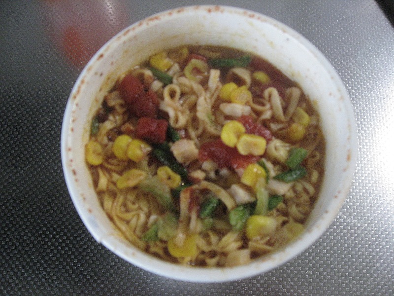 具材は、トマト、味付鶏肉、キャベツ、いんげん、コーン。