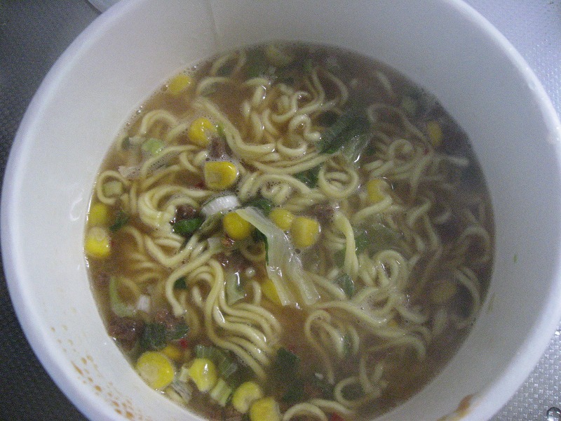 具材はキャベツ、肉そぼろ、コーン、唐辛子、ねぎといった所です。