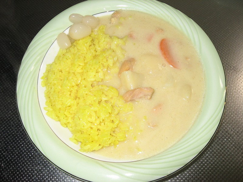ホワイトカレーってやっぱりちょっとスパイシー感が足りないなーって言う気がしますけど、ターメリックライスにすると可也良い感じになります。