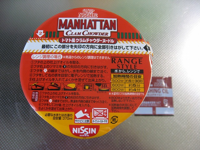 この前食べた「 ニューイングランドクラムチャウダー クリーム風 クラムチャウダーヌードル」の姉妹品の「マンハッタンクラムチャウダー トマト風 クラムチャウダーヌードル」です。