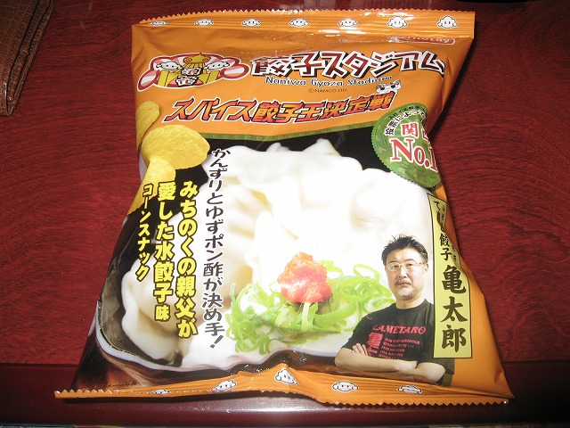 ナムコの「餃子スタジアム」店舗の餃子がスナック菓子になって登場。昨年9月までナンジャタウン池袋餃子スタジアム、浪花餃子スタジアムで開催された「スパイス餃子王決定戦」での優勝店舗の餃子がそれぞれジャパンフリトレー株式会社からコーンスナックとして商品化されました。