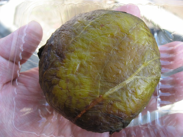 ご飯に味噌を塗った上に青菜漬(せいさいづけ)を巻いて炭火で炙ったものでした。