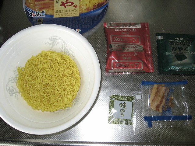作り方に従いお湯を注いで待つこと4分、別の容器にお湯を貯めて置きそこでレトルトパックも同時に温めておくいつもの作り方ですね。
